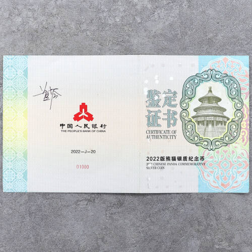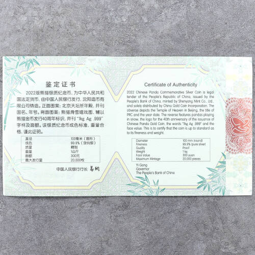2022年1公斤熊猫银币证书