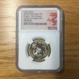 描 述:2024生肖龙首期剪纸龙标,上海厂铭,PF69分;2019年泰山币首期泰山标,PF67分;同三尾016。