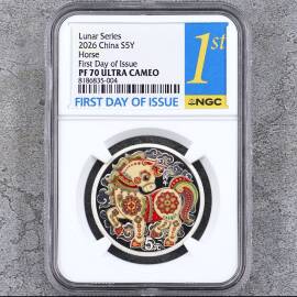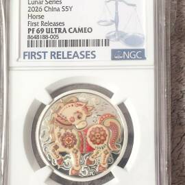 描 述:2026年马年生肖银币,15克,面值5元,Lunar Series,彩色工艺,NGC评级PF69 Ultra Cameo,首期蓝标,带原装评级盒和证书,编号8648188-005。币面保存很好,几乎全