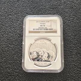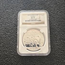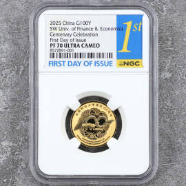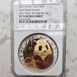 描 述:2017年熊猫金币发行35周年双色纪念章,NGC评级MS70 ANTIQUED,上海造币厂出品,罗永辉设计。正面黄铜,背面紫铜,直径100mm,限量5000枚。品相全新,原装NGC评级壳、礼品盒、证书