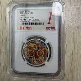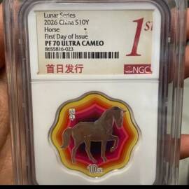 描 述:2026年马年生肖银币,Lunar Series系列,15克彩色精制,5元面值,NGC评级PF70 ULTRA CAMEO,首日标,品相全新未拆封。原装评级盒+官方鉴定证书齐全,号码无4