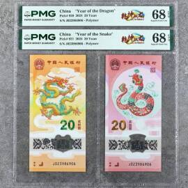 描 述:无47乾坤双龙标,PMG 68EPQ一套,钞号完全相同,均为“J023986906”,高分靓号,极难遇的收藏佳品。