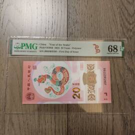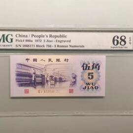描 述:第三套人民币1972年版凸版纺织伍角,PMG 68分EPQ(老壳严评),756稀缺冠号,号码无4,票面凹凸触感明显,无油无斑,原始状态极佳。评级封装,官网可查编号,保真保品。