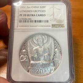 描 述:NGC70首期蓝标限量发行520枚 满分更稀少难得 正面:国宝 熊猫及香港钱币研究会标志; 背面:龙凤图纯银镜面工艺和磨砂镀金精雕工艺