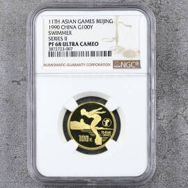 描 述:1994年狗年生肖梅花形2/3盎司银币,NGC-PF69。此枚编号为85号,是前100枚的珍稀小号,极为难得