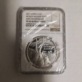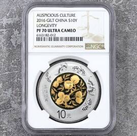 描 述:2016年吉祥文化“五福拱寿”30克镀金银币,NGC PF70 Ultra Cameo满分评级,编号41588,谐音“一世福,发发发”,与“五福拱寿”主题相得益彰,寓意福寿绵长、财运亨通,品相完美