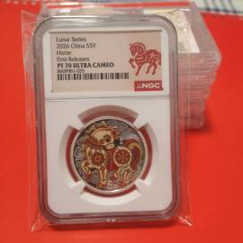 描 述:NGC7Ox1 首期蓝标 限量发行520枚 满分更稀少难得 正面:国宝大熊猫及香港钱币研究会标志;背面:龙凤图纯银镜面工艺和磨砂镀金精雕工艺 评级币以分数为准