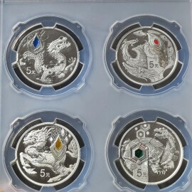 描 述:传统四瑞兽银币一套,15克✕4枚,中国金币,中金国衡首发认证,品相完美,无氧化白班白雾。证书豹子号69222。