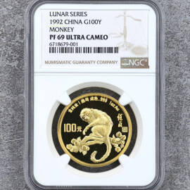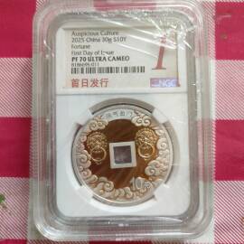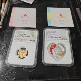 描 述:【2019年吉祥文化珠联璧合金银币】串号001-002。发行量一万枚,心形设计,3克金加30克银,面值10元,带原装评级盒、证书和包装盒,NGC评级PF70 Ultra Cameo,编号00107