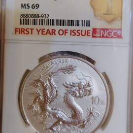 描 述:2025龙年1盎司银币,NGC MS69品相优异,带FIRST YEAR OF ISSUE首发年标及1st特标,评级编号8880888-933,靓号难得。999纯银,龙纹立体,实物如图,无氧化白雾