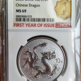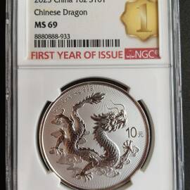 描 述:2025龙年1盎司银币,NGC MS69品相优异,带FIRST YEAR OF ISSUE首发年标及1st特标,评级编号8880888-931,靓号难得一遇,999纯银,龙纹立体,实物如图,无氧化白雾