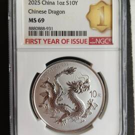 描 述:2025龙年1盎司银币,NGC MS69品相优异,带FIRST YEAR OF ISSUE首发年标及1st特标,评级编号8880888-932,靓号无4无7。999纯银,龙纹立体,实物如图,无氧化白雾