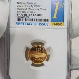 描 述:2025年3克国家宝藏商鞅方升金币,NGC首日金兰标 NGC70分,证书号:2675,75年2月6日生日号。
