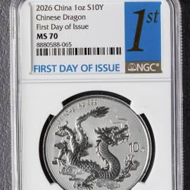 描 述:2026龙年1盎司银币,央行发行,NGC MS70满分品相,稀缺首日1st标签,编号8880588-065(888开头吉祥靓号,寓意发发发)。 原封,完美未流通,收藏送礼首选,顺丰