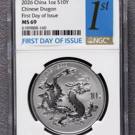 描 述:2026中国龙1盎司银币,999纯银,面值10元。NGC MS69,金南首日1st标签,靓号6189888倒置号,品相完好,实物拍摄,一口价,
